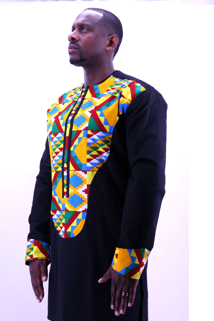 Tunique longue pour homme à manches longues. La touche de wax en imprimé Kenté (Tissu traditionnel qu’on retrouve généralement au Togo, Ghana et Côte d’Ivoire) sur la poitrine et les manchettes apporte de la gaieté et de l’originalité à cette pièce .