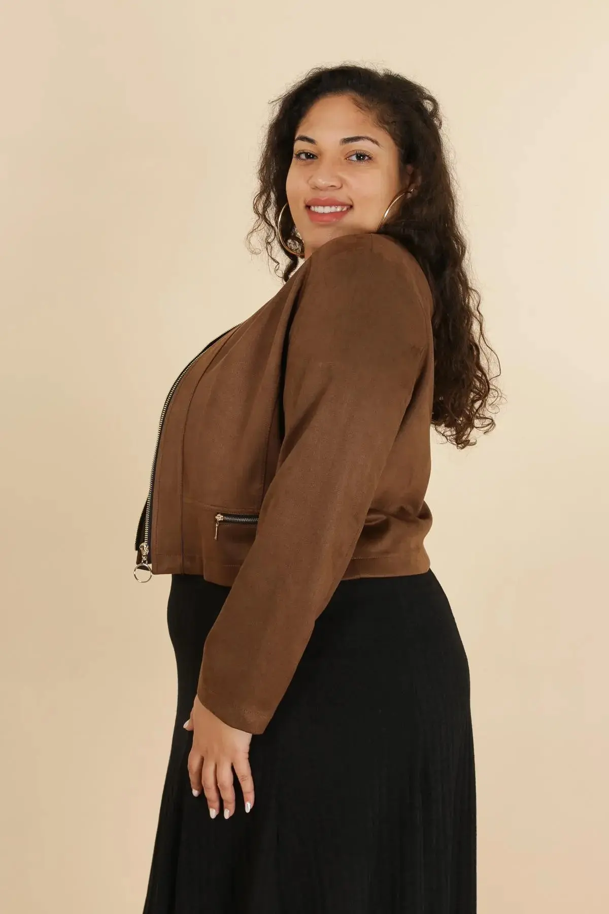 Notre veste courte couleur chocolat , effet daim en suédine, au toucher très doux » peau de pêche « , avec la particularité d’être extensible pour plus de confort !