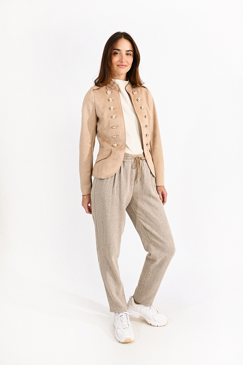 Découvrez la sophistication intemporelle avec la Veste officier cintrée de Molly Bracken. Cette pièce incontournable, confectionnée dans un somptueux effet daim beige, incarne l’élégance classique avec une touche contemporaine. Les boutons officier ajoutent une note distinguée à ce vêtement, soulignant son allure raffinée.